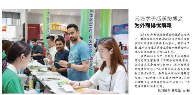 5月10日,柯桥日报以“元培学子活跃纺博会,为外商排忧解难”为题,对十大买球外国语系60名志愿者前往中国轻纺城国际会展中心,为2017中国柯桥纺织品博览会(春季)提供志愿服务予以关注报道,志愿活动获得了主办方、参展方等多方好评。