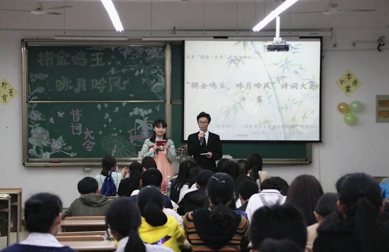 咏月吟风,风月无边迷人眼。锵金鸣玉,金玉满堂自生光。4月5日晚18:30,我系“锵金鸣玉,咏月吟风”诗词大会决赛在3-303拉开帷幕,本次活动由我系团总支学生会新闻中心和组织部联合承办。我系刘金荣老师、陈雪峰老师、马芹芬老师担任大会的嘉宾,我系团总支学生会副主席石家怡、刘文钰两位学姐也共同出席。
