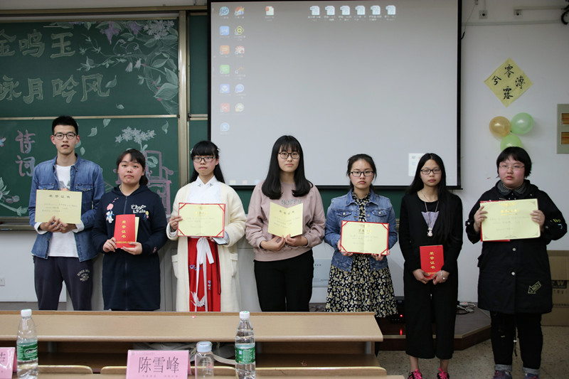 晚上8时许,决赛圆满结束。最终,王雅昕同学凭借出色的表现一举夺得“状元”,邓苗青同学也毫不逊色,夺得“榜眼”,陈汝惠同学夺得“探花”,杨小洁、许妍芳、顾梓凡、王东丹妮四位同学斩获“锦衣才人”的称号。刘金荣老师、陈雪峰老师、马芹芬老师,以及石家怡同学分别为获奖选手颁奖。在热烈的掌声中,“锵金鸣玉,咏月吟风”诗词大会圆满结束,在此对获奖的同学致以最诚挚的祝贺!春风十里,春花烂漫,在这最美的人间四月,让我们对酒当歌,吟诗作赋,以诗词会友,记住这难忘的夜晚吧!