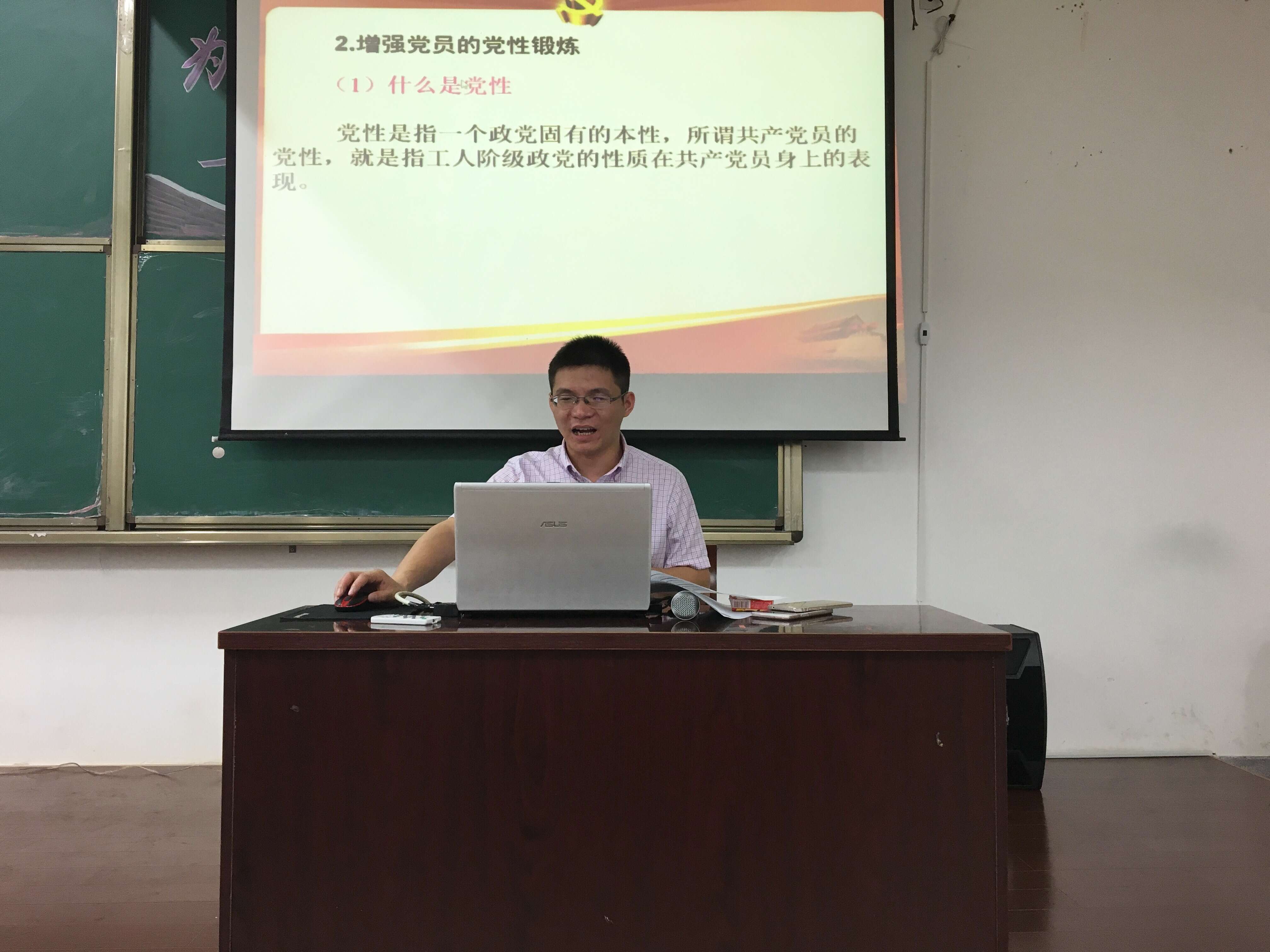 活动伊始,潘书记从中国共产党成立95周年出发,讲到了中国共产党95年的历程与启示,由表及里、从革命时期到改革开放时期,系统地讲述了党的光辉与贡献。接着,潘书记详细地讲解了党章的基本概念、作用、基本结构与内容,更是把习近平总书记强调的一句话——“学习党章,自觉维护中央权威”送给了在场的每位同学。潘书记的一番讲解,使每一位学生知道了合格党员的标准是什么,作为党员又该以什么标准严格要求自己。紧接着,潘书记提到了2016年在全体党员中开展的“学党章党规、学系列讲话,做合格党员”学习教育,即“两学一做”学习教育活动,具体讲了“两学一做”的概念和开展的目的。简短有力的介绍使在场同学加深了对党内在的认识,更让想入党的同学进一步明确了自己的学习目标,加强对自身能力的培养,争取做到讲政治、有信念,讲规矩、有纪律,讲道德、有品行,讲奉献、有作为。