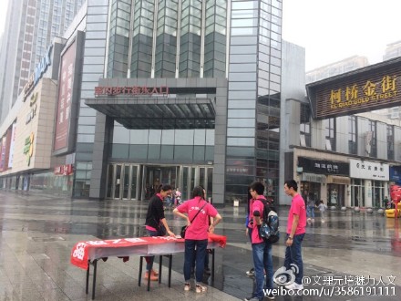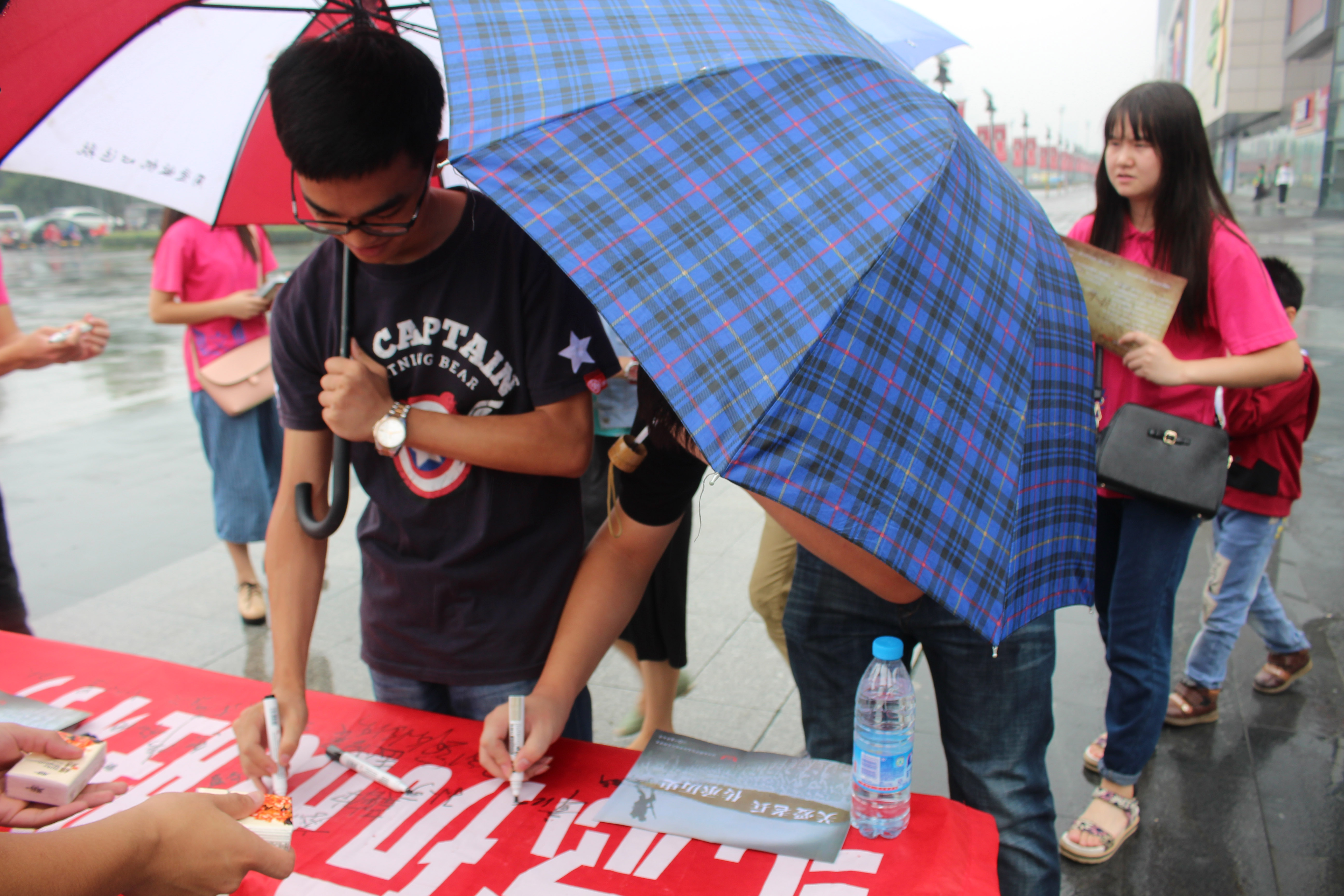 “若夫淫雨霏霏,连日不开”,7月9日,雨势终于出现缓停。我系暑期社会实践小队抓住时机,在绍兴柯桥区万达广场开展了“纪念抗战胜利,关爱抗战老兵”的横幅签名活动。其间,由于场地问题,实践小队特向万达广场物业管理部寻求了帮助,相关负责人了解详情后,热情地开具了场地借用书,并派人为实践小队成员送去问候,提供桌椅等物品。实践小队成员对于这样的热忱,提前感受到了浓浓暖意,利索地布置好场地后,便投入到准备工作中。