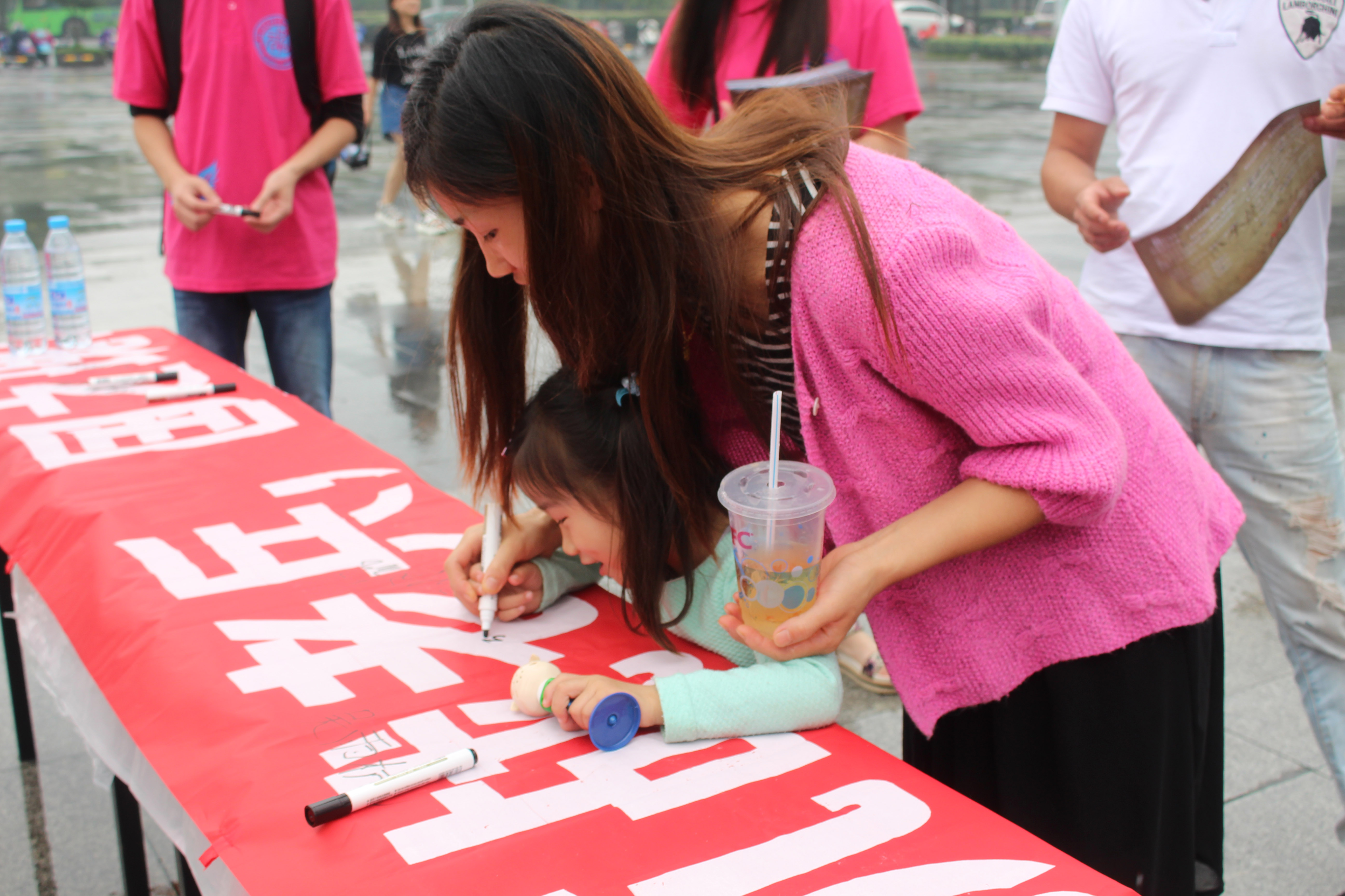 中午11点左右,活动正式开始,两人拉横幅,两人发宣传单,三人负责为路人阐述详情,其余两人则负责摄影录像,明确的分工为活动的成功奠定了基础。“纪念抗战胜利,回眸峥嵘岁月”,醒目的红色横幅成了当时最亮的风景线,伴随着主席们动情地回忆宣讲,引得不少路人驻足观看。令人惊喜的是,活动进展格外顺利,发传单人卖力的宣传引起不少路人的好奇心,再经横幅旁三人用心地阐释活动初衷,路人们纷纷表示赞成理解,都表示十分愿意在横幅上签下名字,以表对抗战老兵的支持,及对实践小队为公益所付出的鼓励与肯定。值得一提的是,有不少小学或初中的学生也闻讯前来签字,有母亲握着幼小孩童的手,在横幅上一笔一划,郑重的刻上了自己的爱心,大家表示会记住那段峥嵘岁月,感谢的同时,这也让实践小队对社会正能量产生了更大的期待。每位路人都会受到实践小队制作的纪念宣传册和一包面巾纸,价值虽小,但意义非凡。短短一个小时,横幅上就是大半的黑色笔迹。