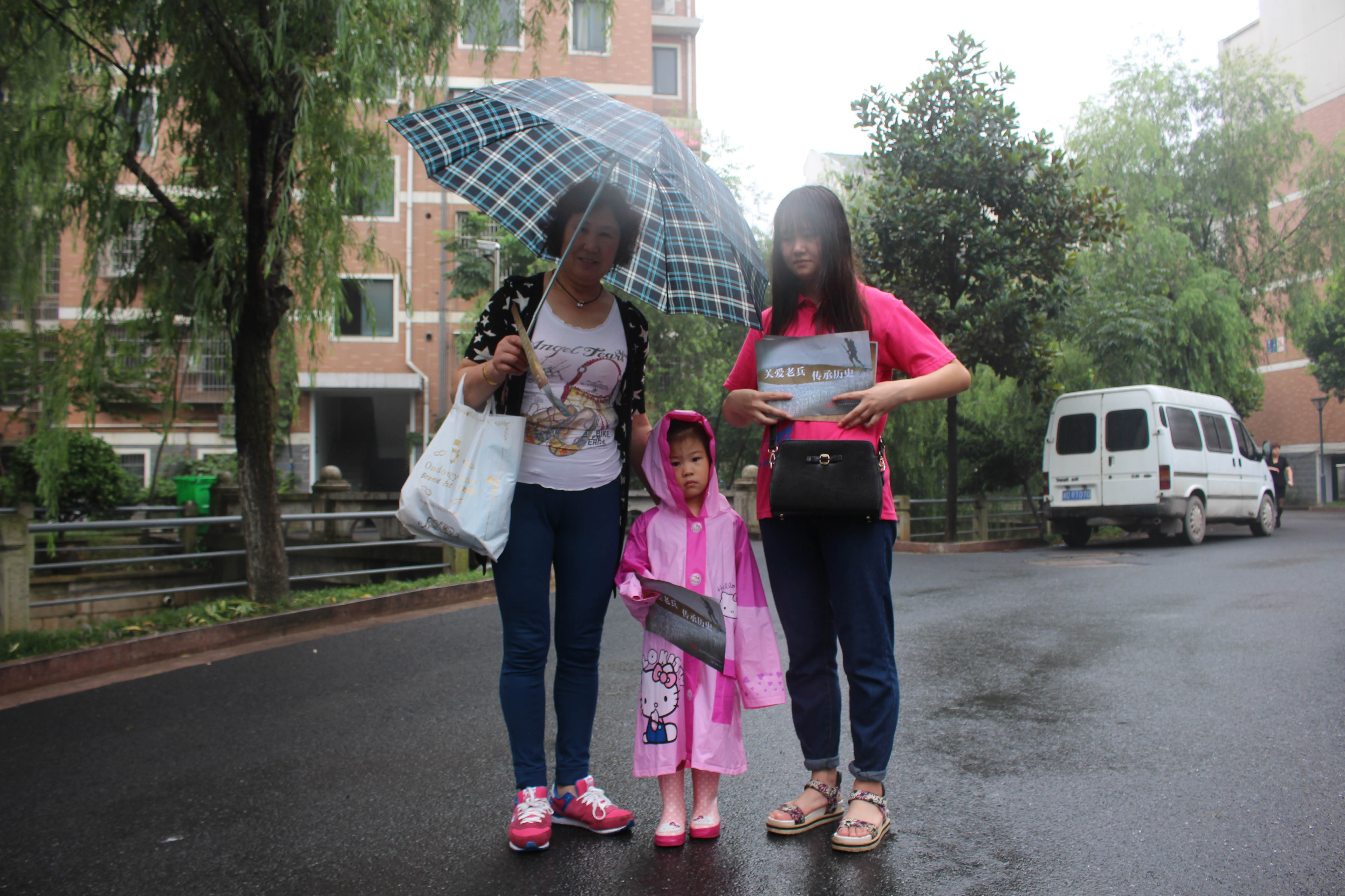 社区内,实践小队负责中负责采访的同学积极热情,为遇见的每一位住户耐心解说,他们的动力,便是将“关爱老兵,传承历史”的主题观念延续下去,使更多的人能够铭记抗战历史,也记住这些曾经在战场上不畏牺牲,坚守在自己岗位的军人们的光荣事迹。其间实践小队遇到了一对母女,妈妈本该是带着小女儿去上课,她一手打着伞,一手帮着小女孩提书包不让她走偏在雨里,显得有些艰难。当采访人员犹豫是否该上前时,她对着相机的镜头莞尔一笑,自然地将伞柄夹在了肩上,接过了宣传单。在倾听了实践小队的解说后,阿姨表示,这是有意义的事,也十分愿意支持这样的公益行动。“抗战70周年胜利,我以后也会教育孩子铭记历史,继续传承下去。”