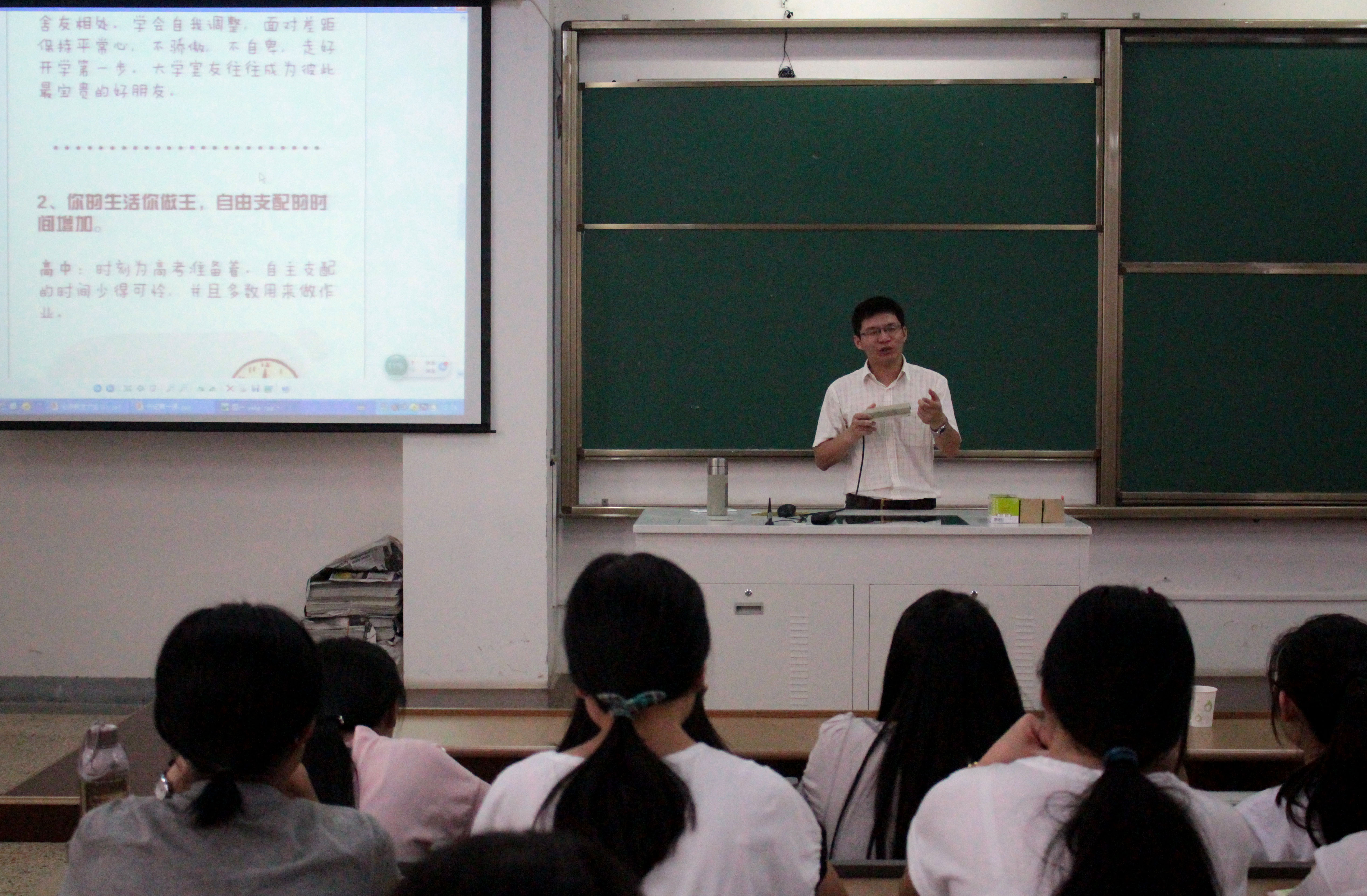 大会伊始,主讲人潘书记围绕“大学的大,怎么样读大学”的主题,细致地为我系新生描绘了一副全新的大学生活蓝图,并提出“大学之大,就是在有限的空间孕育无限的精神和文化”的观点进行论述,将“大学”这个抽象的概念转化为形象的见解,首次给带来新生不一样的大学体验。潘书记更是提出了“学会自学”的学习理念,告诫全体新生上大学,归根结底要让自己成为一个有人文素养的人,通过“勤、慎、诚、恕”四条标准来不断加强自身人文修养,才能活出属于自己的大学生活。