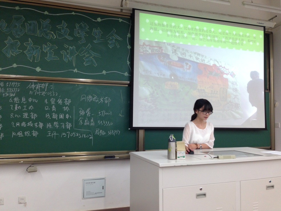 9月14日晚上6:30,我系学生会在人文楼203、205、208教室召开了招募新成员的宣讲会,教室中座无虚席。本次招新宣讲会旨在为我系2014级新生答疑解惑,增进新生对系团总支、学生会的了解与认识,从而更好地选择感兴趣并适合自己的部门,找到施展才华的平台。