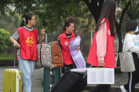 随着新生的逐渐增多,身穿蓝白色制服的迎新工作人员从止步校门的新生父母手中接过新生的行李和随身物品,带领他们前往分院报道点,他们用温暖的微笑、热情的话语、耐心周到的服务,让初来乍到的同学们感受到安心和温暖,身穿红色马甲的分院志愿者为新生搬运行李,答疑解惑,满是对新生的浓浓关怀。蓝白色与红色的交织,构成了语言文学分院迎新现场最动人的色彩。