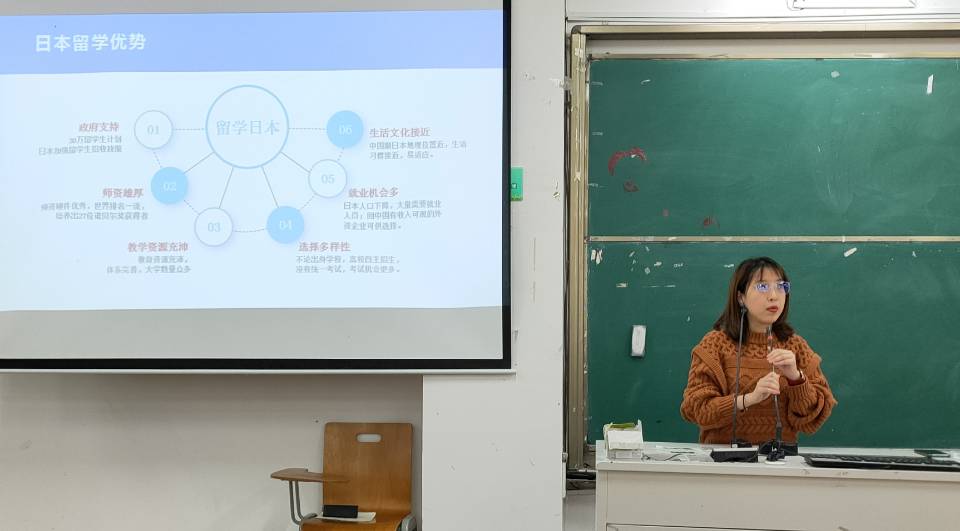 讲座伊始,沈老师介绍了留学日本的优势,她分别从政府支持力度、师资雄厚、教学资源充沛、选择多样性、就业机会多和生活文化与国内接近等方面进行了详细的讲述,增进了学生对留学日本的了解。之后,她向学生提供了赴日留学的全方位指南,并进行了科普分享,如日本大学分类、各大名校、中日名校对比等。