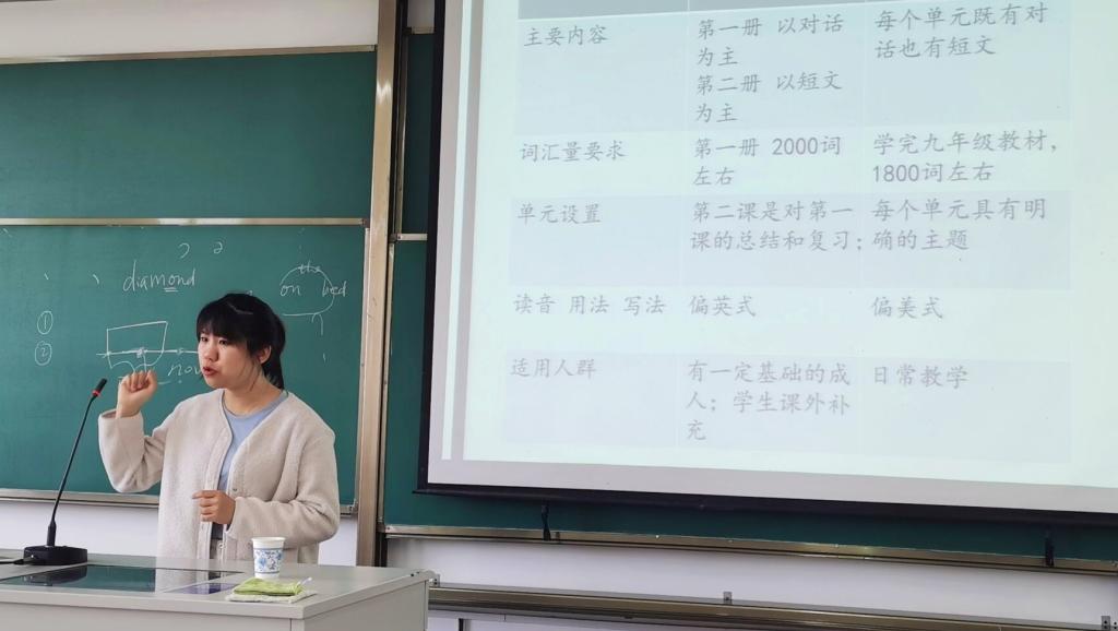 讲座伊始,曹慧介绍了自身的教学经历:从事英语教学工作多年,熟悉人教版教材的编写和重点,对初中学生的英语学习现状、中小学英语考试重点有着全面的了解。接着,她以两段法语为例,指出中小学生对陌生英语的态度同大学生对法语的态度是一样的。因此,曹慧提出:教师上课时应当以学生为主体,从学生角度出发,以学生的心态给他们讲课。同时,她还介绍了中小学生在不同年龄阶段需要掌握的具体词汇数量以及新概念版教材和人教版教材在内容、用法、适用人群等方面的区别。