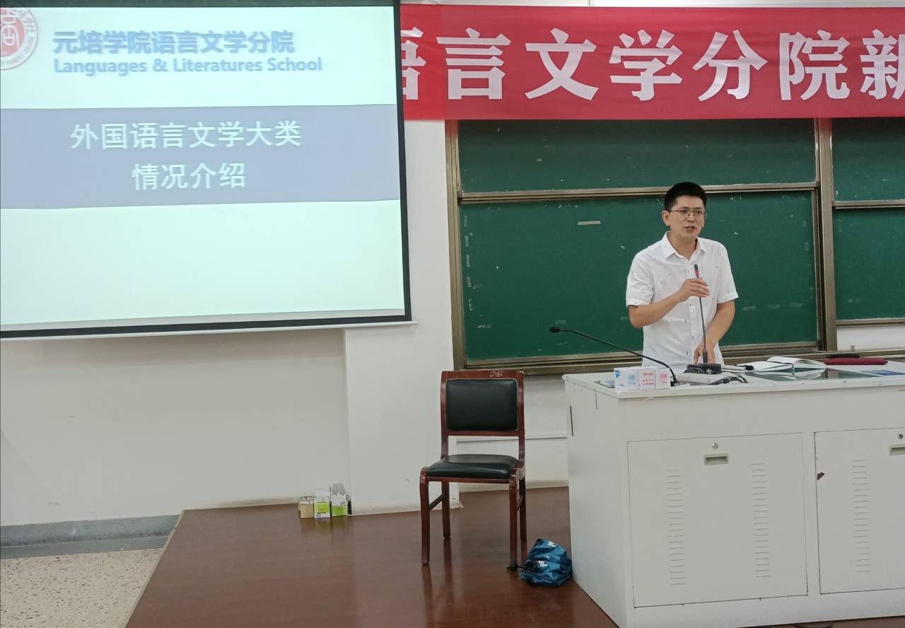 随后,为了让学生深入了解所学专业的重要性,刘金荣、刘义分别对该专业的相关内容作了进一步讲述。刘金荣结合汉语语言的专业特质对学习好该课程应有的学习的目标、学习的原则进行详细讲解,其中学习的两大原则:一、构建专业知识结构;二、培养重点兴趣爱好。该原则的提出对于刚进入全新环境学习的学生来说非常重要,有利于学生在大学阶段懂得从哪些方面努力,从而更好地发展自我。刘义则从外国语言文学专业的培养目标、学习内容以及就业方向进行讲解,提到外语专业旨在培养适应地方经济建设和社会发展需要,具备良好人们素养和职业道德的复合型外语人才,因此学生们在学习中应当始终保持认真的态度。最后刘金荣、刘义表达了与学生携手做好元培人,共筑元培情的思想。