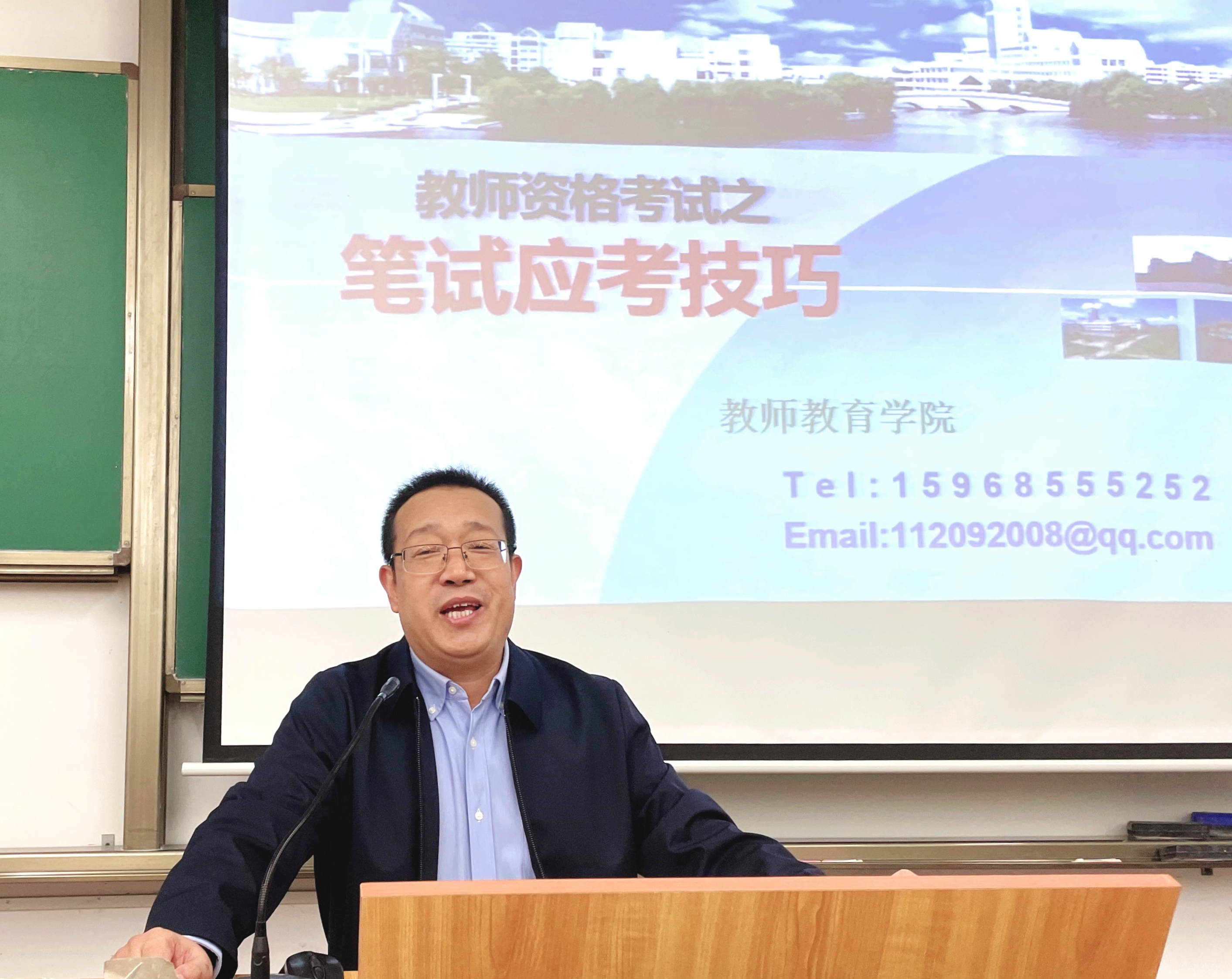 讲座伊始,闫瑞祥通过大量的数据分析,介绍了教师资格国家考试概况;紧接着,闫老师分析了近年来教师资格笔试试题的特点,并就相应的复习及应考技巧进行了介绍,为复习冲刺阶段的同学指明了方向。