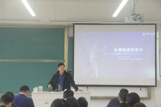 集中学习后,分院特邀浙江大学硕导金月成教授做了题为“金课铸魂育英才”的讲座。金教授结合自身经历,从用情、用力、用心三个方面就教师如何做好教学工作做了分享。