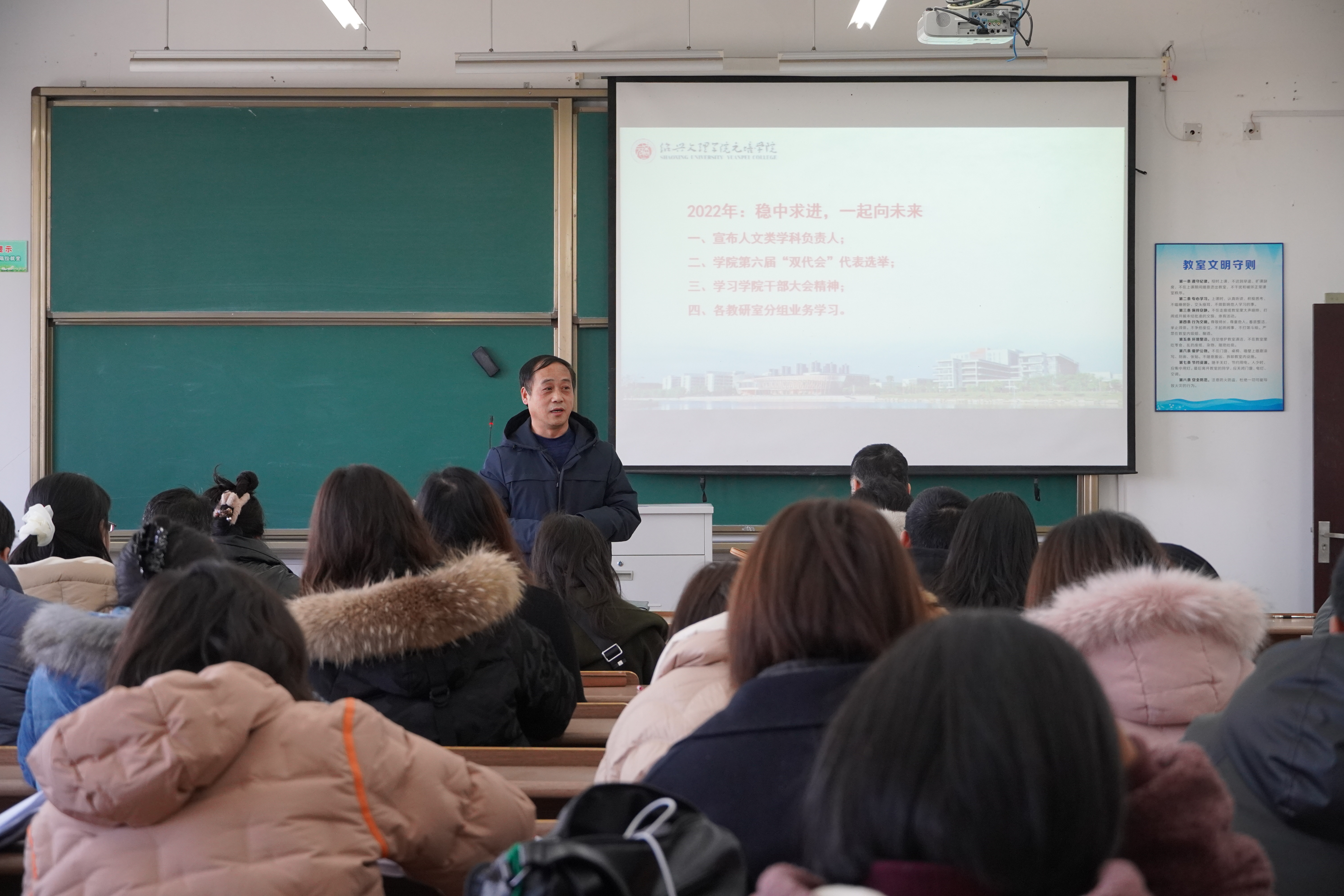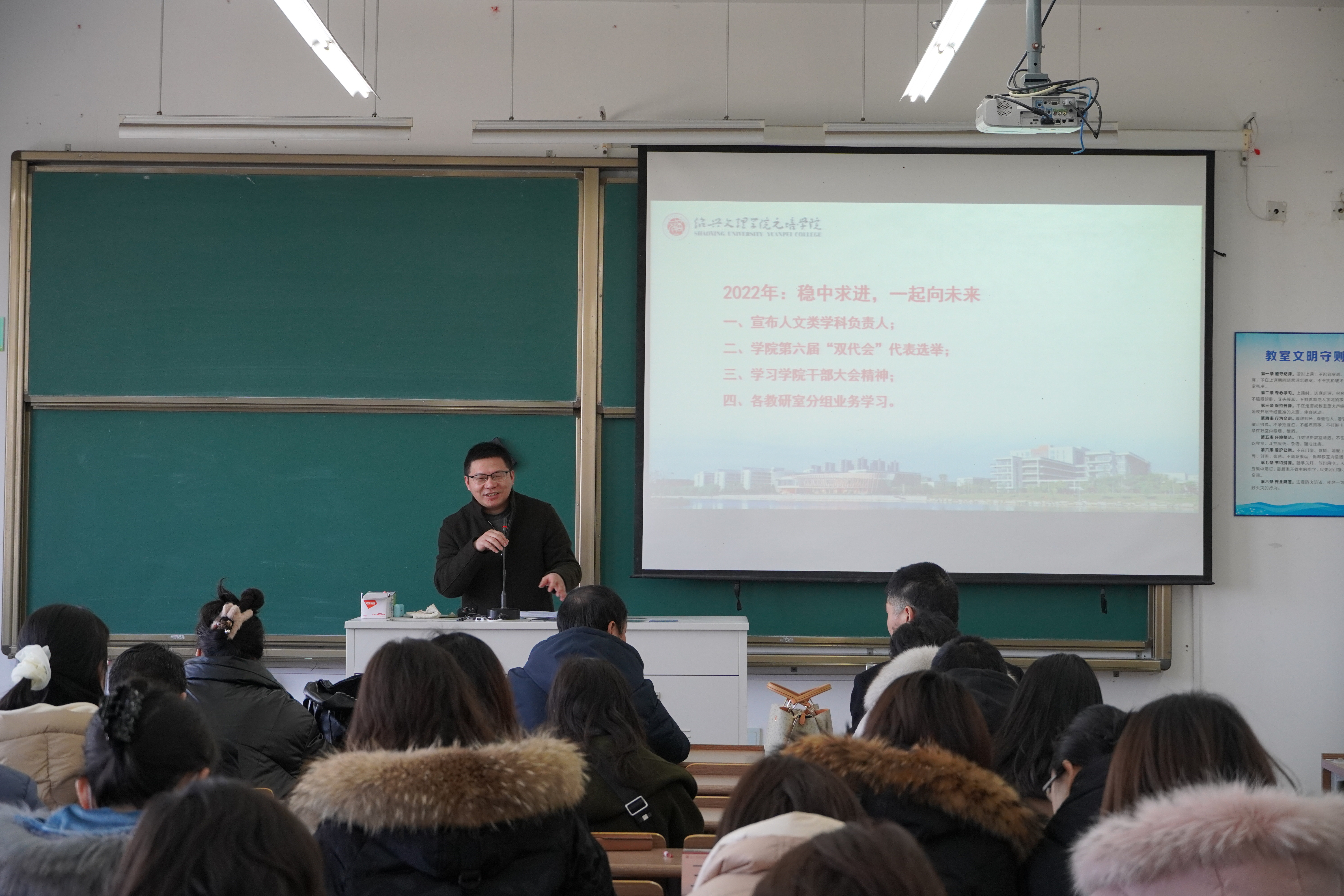 24日下午,分院在402召开了全体教师大会,会上传达了学院干部大会有关精神并选举产生了学院第六届“双代会”语言文学分院代表团成员。学院副院长周思红出席大会并讲话,分院全体教职员工参会,大会由分院党总支书记潘成刚主持。
