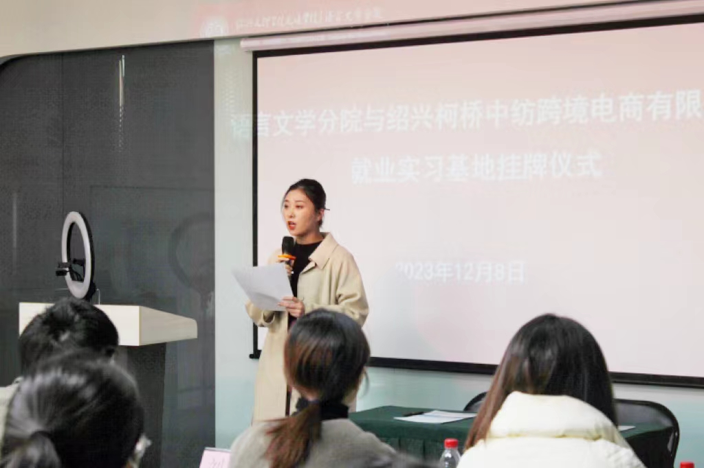12月8日上午,语言文学分院与柯桥中纺跨境电商有限公司隆重举行就业实习基地挂牌仪式。柯桥区商务局电子商务科科长马金良,分院副院长刘义等相关教师,柯桥中纺跨境电商相关部门负责人以及分院英语专业60余名学生参加了本次活动。