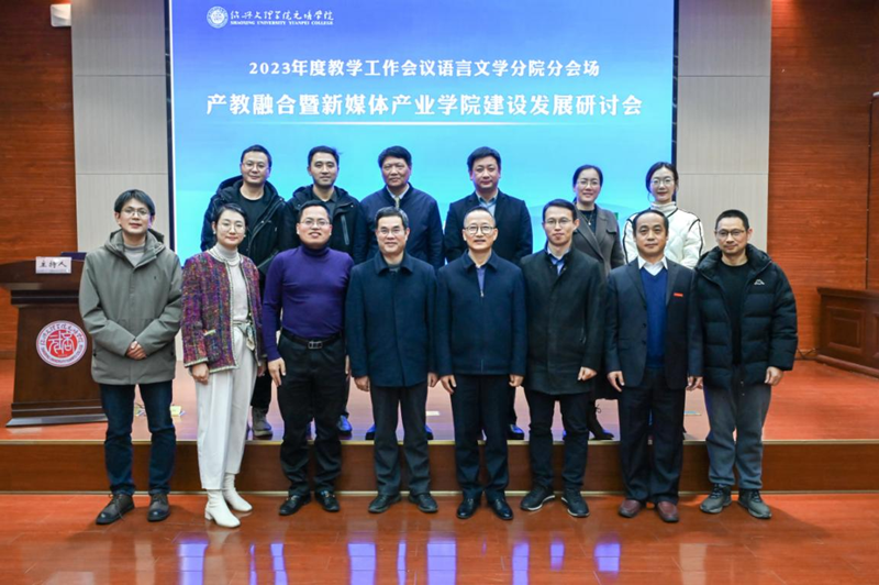 12月13日下午,语言文学分院产教融合暨新媒体产业学院建设发展研讨会在图书馆828会议中心召开,学院院长沈红卫、副院长周思红、绍兴文理学院外国语学院院长胡朋志、人文学院副院长陈蘅瑾、浙江日报报业集团绍兴分社总监周智敏、绍兴市越城区融媒体中心主任张羽、绍兴柯桥中纺跨境电商有限公司副总经理傅海姣、绍兴悠扬传媒有限公司陆建祥、浙江立尚文化传播有限公司董事长劳立江等院校、企事业单位专家以及分院教师代表40余人参会。本次会议主题为“深化产教融合,赋能高质量发展”。会议由分院相关负责人主持。
