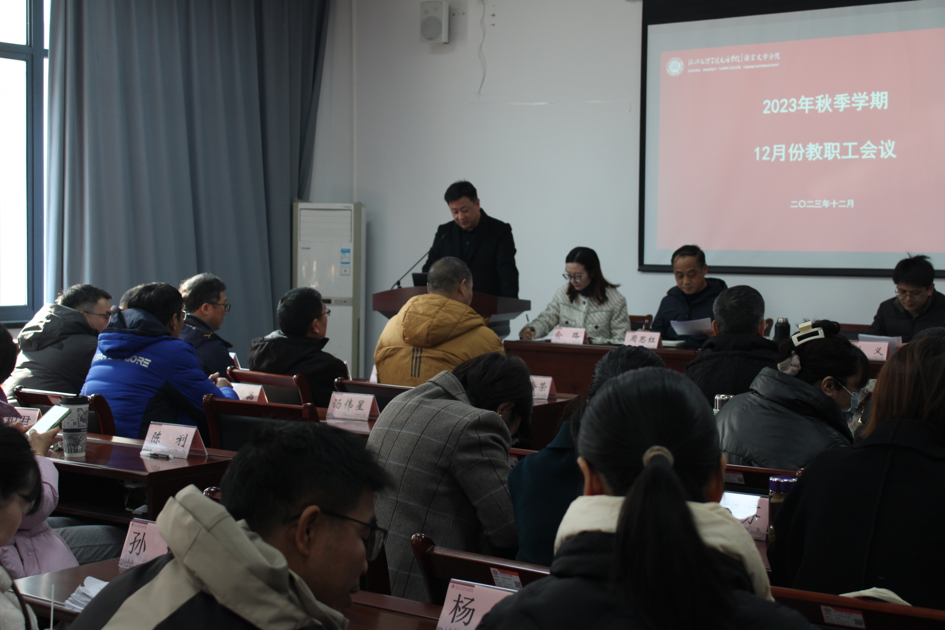 12月27日下午,语言文学分院年度教职工会议暨二级工会会议顺利召开。学院副院长周思红,分院党政领导班子以及全体教职工参加会议。会议议程包括:分院领导述职报告、教职工年度考核、刘金荣教授荣休仪式、综合建设奖5%分配方案表决等。会议由语言文学分院副书记主持。