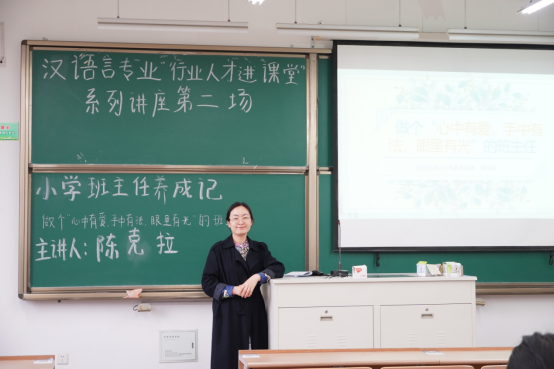 4月14日下午2点半,语言文学分院于教学楼4—202举办了汉语言文学专业第二场行业人才进课堂系列讲座。本次讲座由语言文学分院讲师刘金荣老师主持,讲座邀请到了绍兴小学教师陈克拉老师担任主讲老师,分院众多学生到场聆听此次讲座。