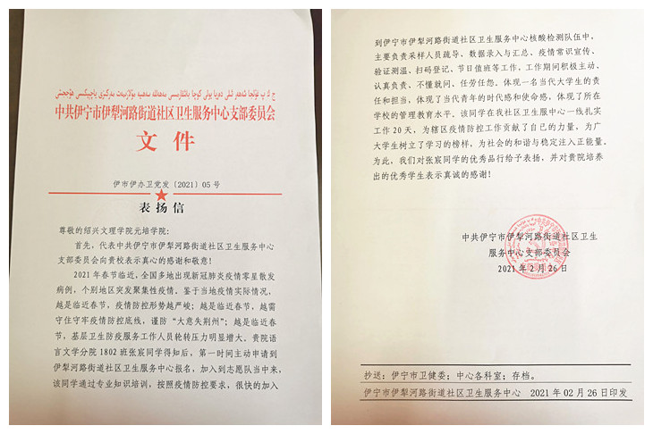据了解,今年春节前夕,张宸了解到当地防疫工作压力大、人员不足的情况后,主动报名了当地的志愿队,后加入伊宁市伊犁河路街道社区卫生服务中心核酸检测队伍。工作期间,他负责采样人员疏导、数据录入与汇总、疫情常识宣传验证测温、扫码登记、节日值班等多项工作,做事认真仔细,积极主动,得到了社区支部委员会与工作人员的一致赞赏。信中写道:“该同学在我社区卫生服中心一线扎实工作20天,为辖区疫情防控工作贡献了自已的力量,为广大学生树立了学习的榜样,为社会的和谐与稳定注入正能量为此,我们对张宸同学的优秀品行给予表扬,并对贵院培养出的优秀学生表示真诚的感谢!”