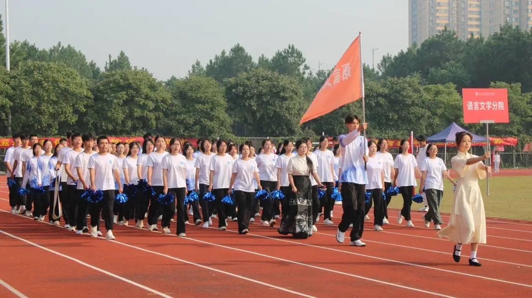 青春正当时逐梦展英姿。伴随着音乐的响起,学生主持,会徽,各分队依次入场,语言文学分院的同学们身着白色的院服,迈着整齐的步伐,喊着响亮的口号热情洋溢,斗志昂扬。啦啦操队员们脚踩节拍,动作灵动,充分展现了语院学子的青春活力
