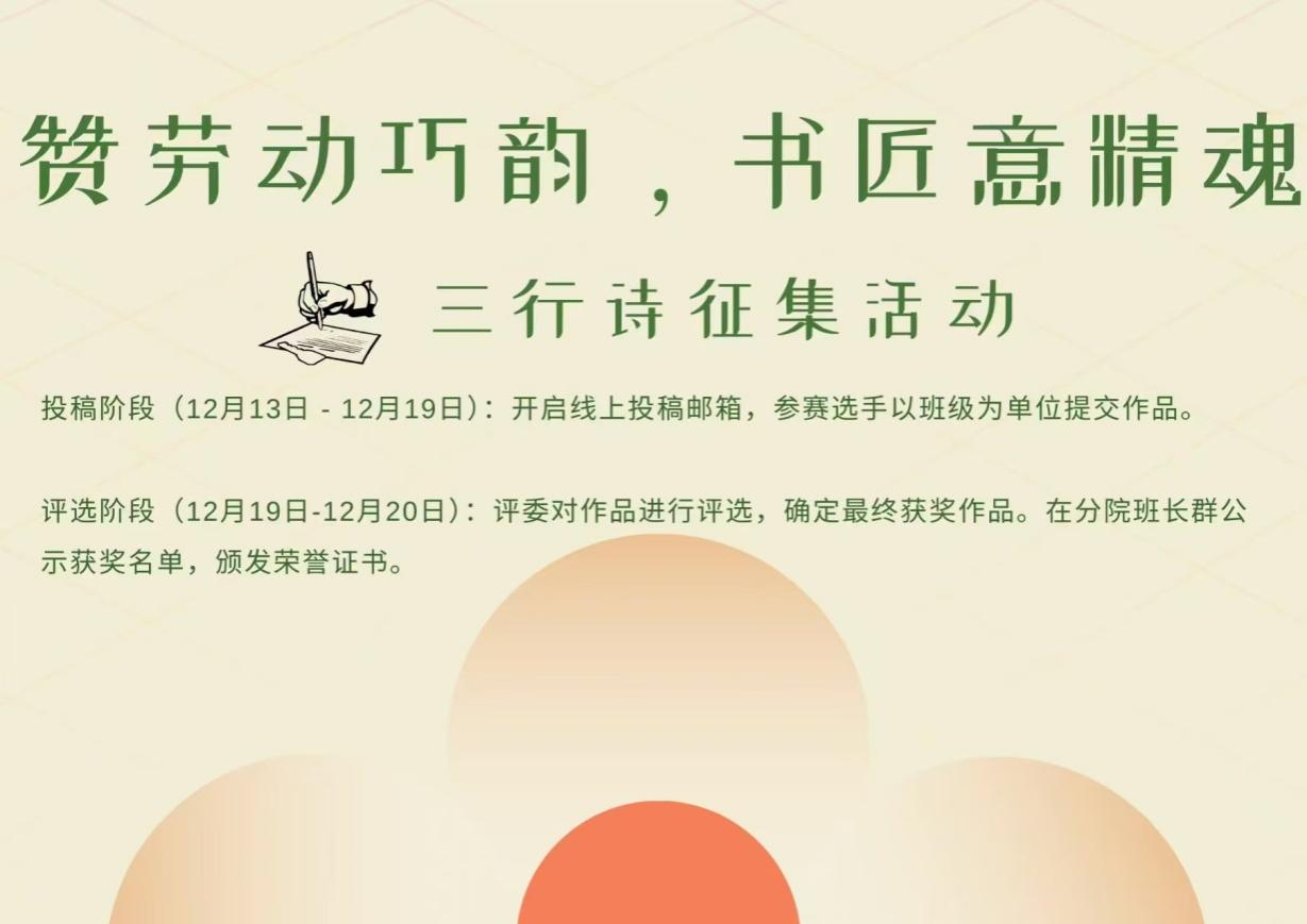 为在校园中大力弘扬劳动精神,促进其传承与发扬,深度培育学生工匠精神,同时也为进一步丰富校园文化内涵,引领学生深刻领悟劳动的伟大价值,语言文学分院举办了主题为“赞劳动巧韵,书匠意精魄”的三行诗创作比赛。