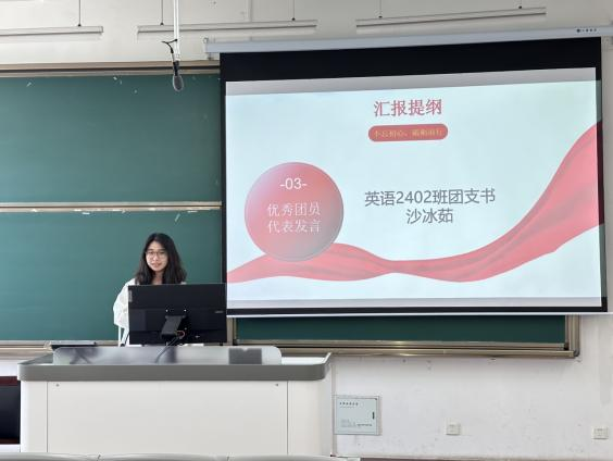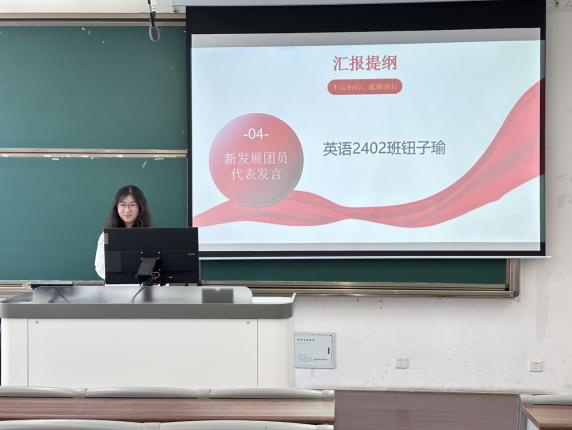 新团员代表英语2402班钮子瑜同学发表了入团感言。她表达了对能够加入共青团这一光荣组织的喜悦之情,并代表全体新团员郑重承诺:将努力学习科学文化知识,积极参加社会实践,不断提高自身综合素质;将热爱祖国,热爱人民,坚决拥护党的领导,树立正确的世界观、人生观和价值观;将乐于奉献,团结同学,关心集体,在同学中起到先锋模范作用,为团组织的发展贡献自己的一份力。