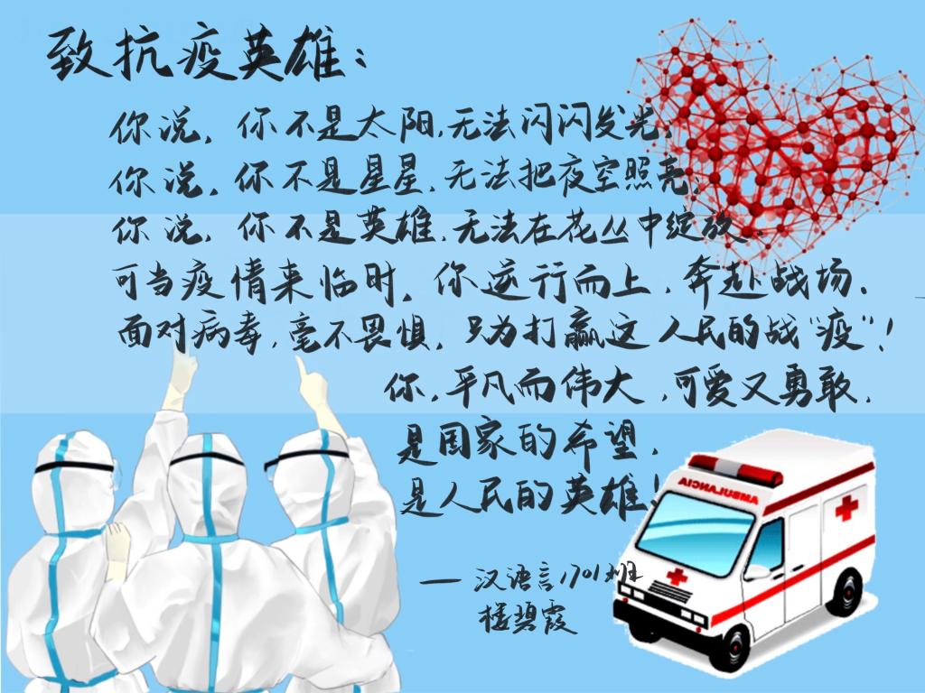 楼碧霞同学用诗歌的形式来歌颂那些原本平凡而伟大的医护人员,在面对疫情时前仆后继的勇气和舍小家为大家的气度,用“希望”“英雄”来表达对医护人员追崇高的敬意和感谢,情感色彩十分浓郁。语言直白,却仍有韵味。图中以三位医护人员的背影来表现出这逆行者的坚定决心,他们前方是抗疫前线,而他们手指的方向便是希望。