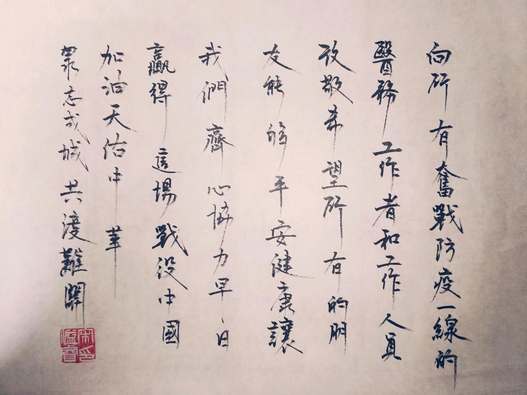 宋溢睿同学用最直白的语言来表达对前线医护工作者的感谢和作者最美好的祝愿,字迹苍劲有力,气势恢宏,其笔势飘若游云,矫若惊龙,一笔一划中都透露出作者浓厚的情感。