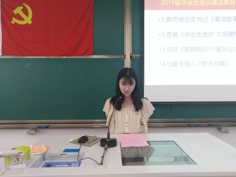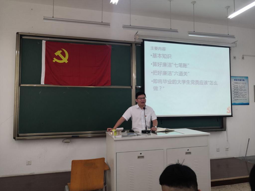 会议伊始,潘书记便列出来了本次会议所讲的大纲,分别从基本知识、算好廉洁“七笔账”、把好廉洁“六道关”以及即将毕业的大学生党员应该“怎么做?”这几点来讲述会议内容。紧接着,潘书记指出算好廉洁“七笔账”要从自身做起、把好廉洁“六道关”即把好初始关、把好亲情关、把好交友关、把好美色关、把好节庆关、把好“小节关”。多次强调毕业生党员应该做到不忘初心跟党走、廉洁自律作表率;做到常怀使命感、牢记责任感;做到清醒面对环境、正确对待权力、谨慎社会交往、诚信科学研究、守住人生底线、保持廉洁奉公的品格以及增强廉洁从业的自律意识。做到自觉抵制不良风气,用知识和才干助推社会的前进,用奋斗彰显人生的底色和亮色,并力求在日后的学习中,做到踏实工作,廉洁诚信,严格以党员的标准要求自己,为母校争光,为学院添彩。