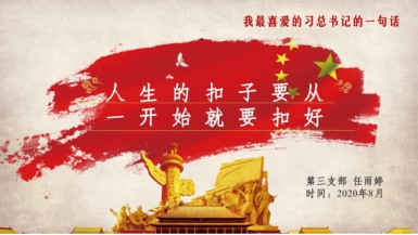 在该次活动中,各位党员同志都积极发表了各自的众多感慨,气氛十分活跃。其中任雨婷同志分享的最喜爱的习近平总书记的一句话是:人生的扣子要从一开始就要扣好。该同志认为“穿衣扣扣子”这一朴素而又生动的比喻,揭示了价值观对于人生成长进步的重要性,充满了习近平总书记对青年一代健康成长的热切关怀和对当代青年树立正确人生价值取向的殷切期望。我们在生活中都有体会,有时候穿衣服发现扣错了,我们可以解开重扣。但是青年人在人生的关键阶段,如果一步走错,后边可能是步步走错,要及时纠正。只有青年时期就系正了第一颗纽扣,那么今后的人生路才能有所作为。