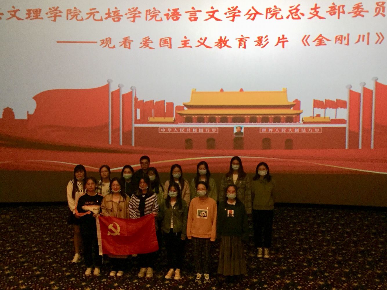 为进一步贯彻党的十九大精神,巩固“不忘初心、牢记使命”主题教育成果,加强全体党员“勿忘历史、奋发图强”的思想意识,语言文学分院第四支部开展了党日观影以及参观周恩来纪念馆活动。11月4日第四支部全体党员、预备党员21人到场观看了电影《金刚川》。此次党日观影活动,不仅是纪念中国人民志愿军抗美援朝出国作战70周年,更是一次深刻的爱国教育活动。电影《金刚川》讲述了抗美援朝后期,志愿军发动最后一次大型战役,金刚川作为战役中重要的军事通道,被敌方轰炸无数次。志愿军顶着炮火,用血肉之躯顽强抵抗,最终顺利发起进攻的英勇故事。