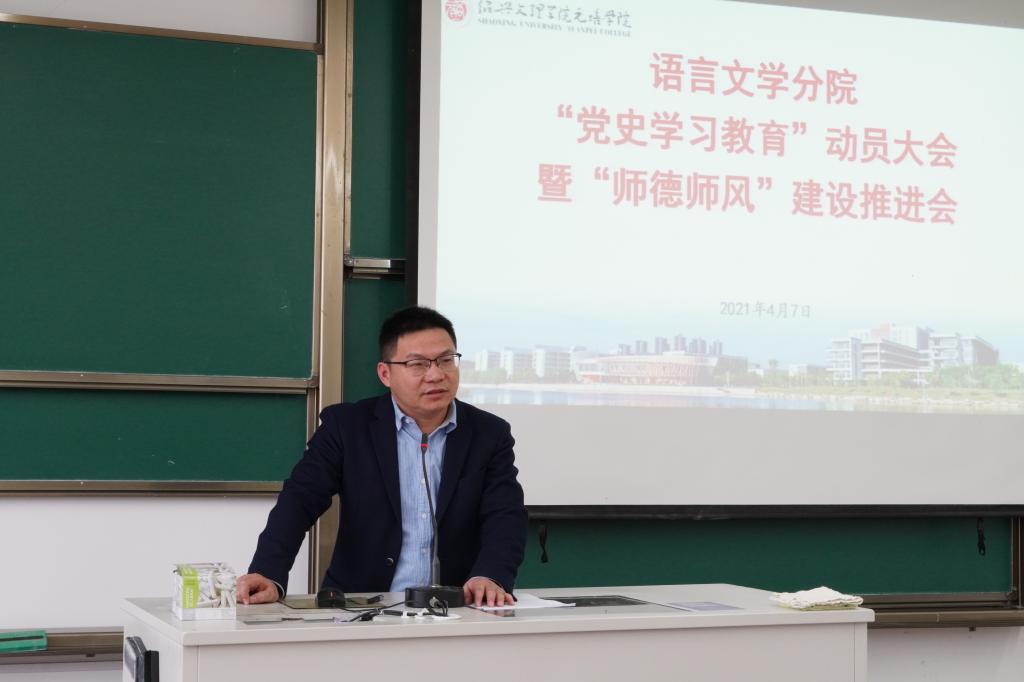 为全面提升分院思想政治素质教育水平,落实学院师德师风建设部署会议精神, 4月7日下午,语言文学分院组织召开 “党史学习教育”动员大会暨“师德师风”建设推进会,旨在以“学党史,强师德,比贡献,促发展”为主题推动工作进展。会议由分院党总支书记潘成刚主持,分院全体教职工参加。
