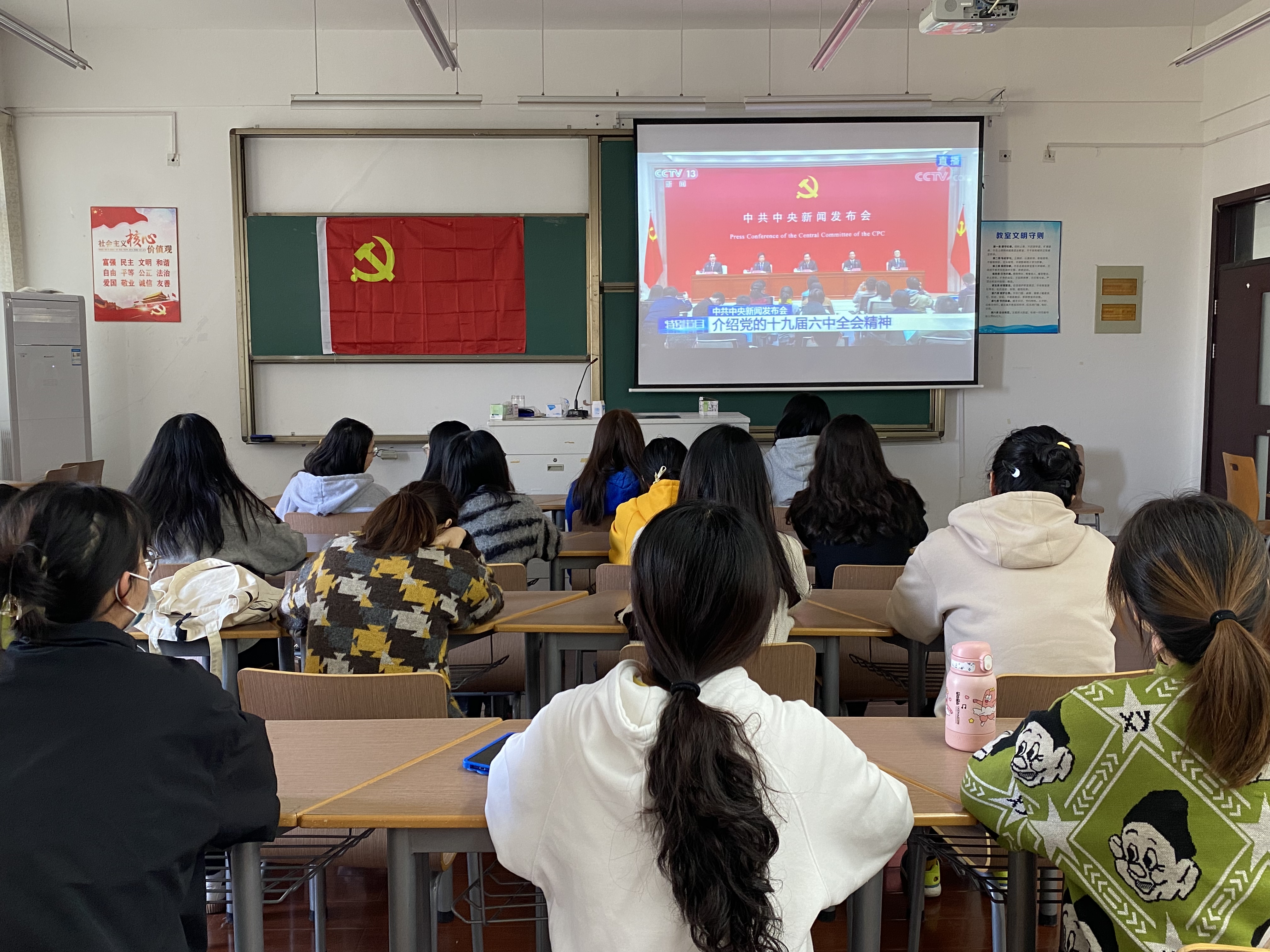 11月12日上午十点,语言文学分院师生通过各种形式收听收看党的十九届六中全会精神新闻发布会直播。分院党员活动室、学生寝室等,处处都可见师生们认真聆听学习的身影。