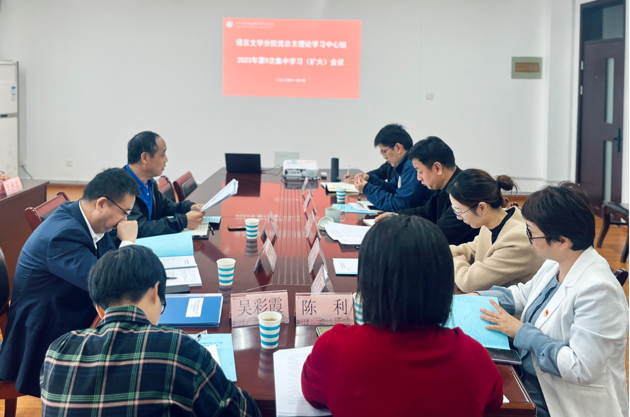 11月8日下午,语言文学分院党总支理论学习中心组召开2023年第9次集中学习扩大会议,专题学习习近平文化思想。学院副院长周思红作主题党课,会议由朱磊主持,学工部部长严兴尧、分院党总支理论学习中心组成员、各党支部书记、委员等参加学习研讨。