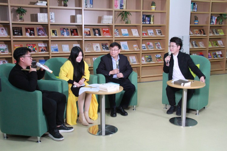 张亚妮和吴世永、林立在台州学院图书馆开讲座(或说文学沙龙),缅怀金庸。(当时金庸先生刚逝世)